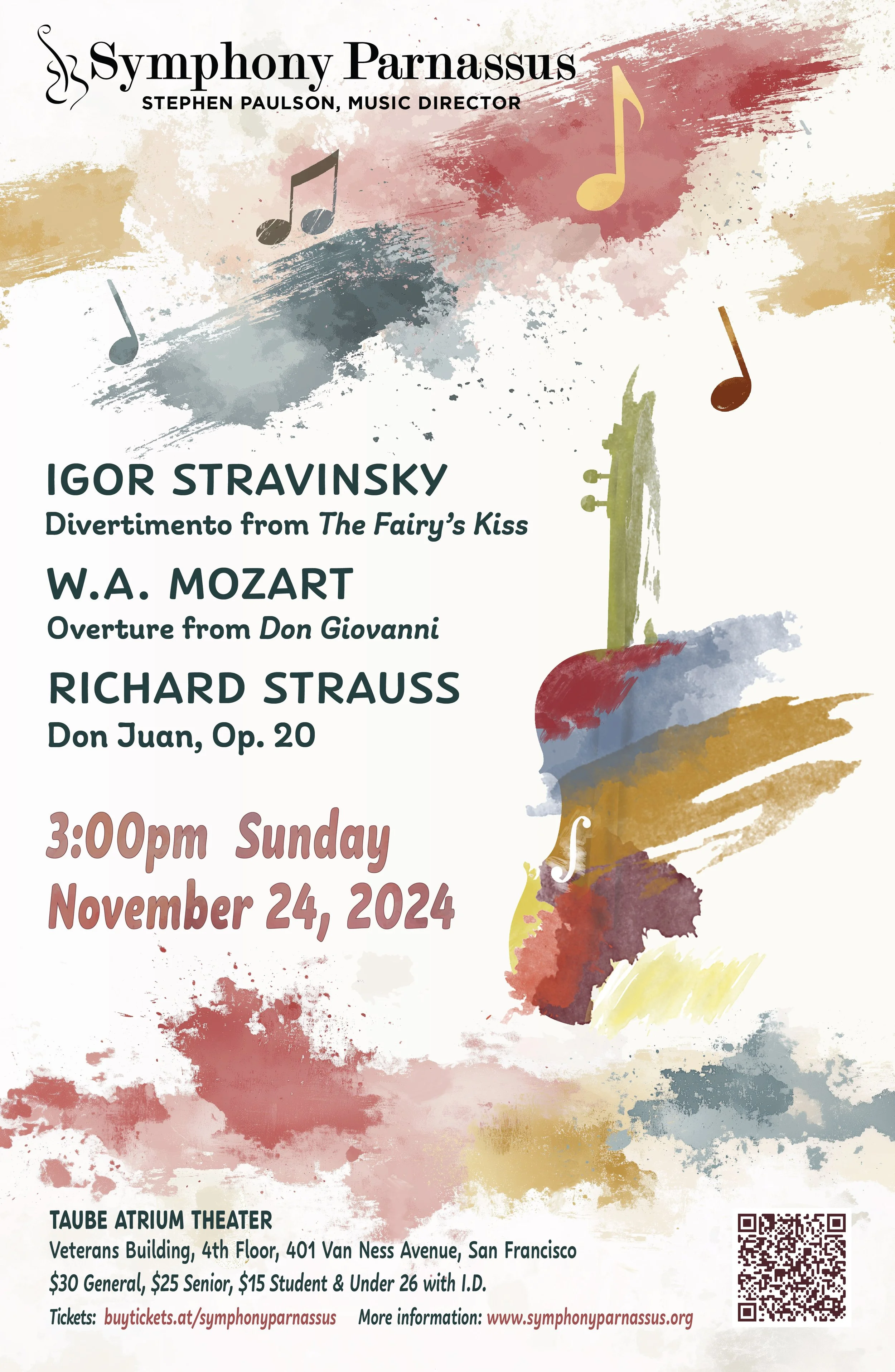 For our season opener, Symphony Parnassus takes you on a journey through the realms of human passion, mystery, and the supernatural. The concert begins with Stravinsky’s Divertimento from The Fairy’s Kiss, inspired by Tchaikovsky, where neoclassical elegance meets tender emotion, painting a whimsical fairy-tale world enchanted by a magical kiss. Next, Mozart’s Overture to Don Giovanni draws us into a world of dark intrigue and playful energy, setting the stage for the famous seducer’s thrilling exploits. To conclude, Richard Strauss’ Don Juan, Op. 20 sweeps us into the hero’s passionate pursuit of life, love, and adventure. With radiant melodies and fiery orchestration, Strauss captures the irresistible allure—and tragic fate—of this legendary figure, leaving us breathless.