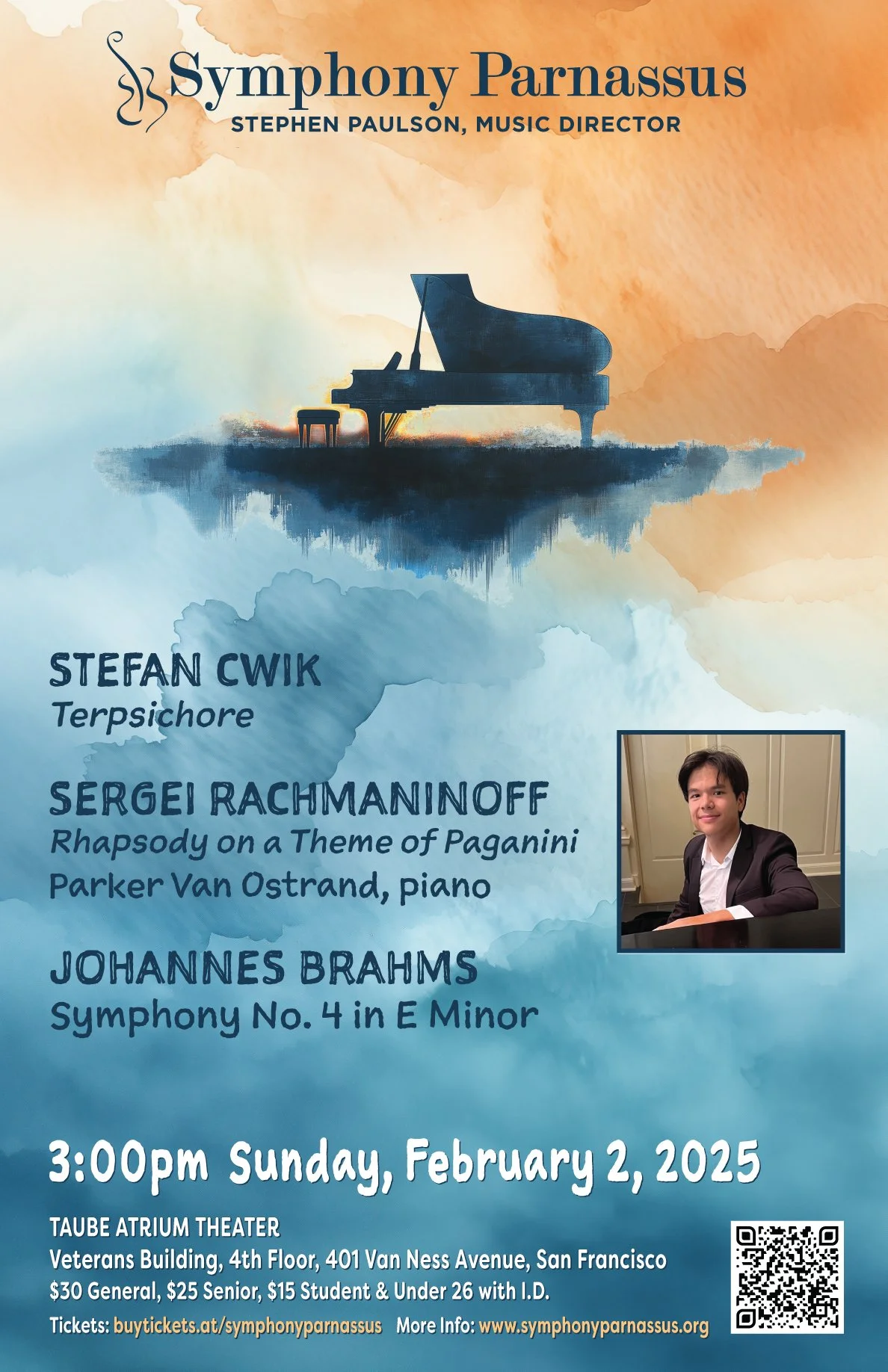 Join us for an inspiring Winter Concert that explores the beauty and depth of music across generations. The concert begins with Stefan Cwik’s Terpsichore. First premiered by the Juilliard Orchestra, this orchestral tone poem signifies the birth of Terpsichore, muse of dance from Greek Mythology. Next, the remarkable Parker Van Ostrand brings his talent to Rachmaninoff’s Rhapsody on a Theme of Paganini, a thrilling mix of virtuosity and heartfelt romance. The concert concludes with Brahms’s profound Symphony No. 4 in E Minor, a passionate and powerful work that takes listeners on an emotional journey. Don’t miss this memorable afternoon of music!