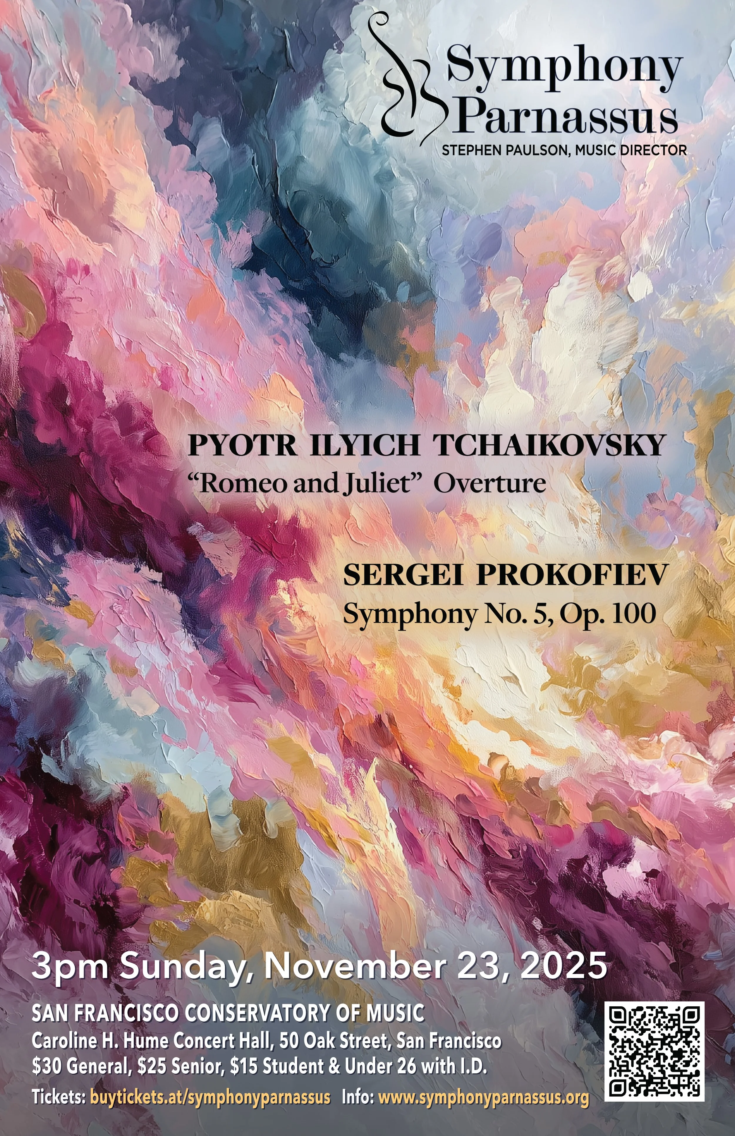 Experience the drama of star-crossed lovers and the triumph of the human spirit at Symphony Parnassus! Tchaikovsky's passionate "Romeo and Juliet" Overture sets the stage with its sweeping romance. The afternoon culminates in Prokofiev's monumental Symphony No. 5, a powerful musical journey from darkness to victory that will leave you breathless. Don't miss this extraordinary blend of timeless passion and innovative artistry on Sunday, November 23 at 3:00pm at San Francisco Conservatory of Music. Secure your tickets now for an unforgettable afternoon!