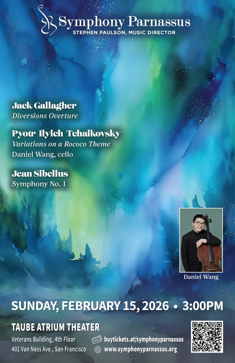 Symphony Parnassus presents a thoughtfully curated program that spans American landscapes, Russian elegance, and Nordic drama. The afternoon opens with Jack Gallagher's Diversions Overture, moving from relaxed, Copland-like Americana to sweeping cinematic melodies before settling into a peaceful prairie sunset. Rising young cellist Daniel Wang then takes center stage for Tchaikovsky's beloved Variations on a Rococo Theme, a graceful showcase that blends classical restraint with romantic warmth and virtuosic flair. The concert culminates in Sibelius's powerful Symphony No. 1, a work of dramatic intensity that moves from brooding darkness to triumphant resolution. Join us Sunday, February 15 at 3pm at Taube Atrium Theater for an afternoon that journeys from the American West to Imperial Russia to the forests of Finland.